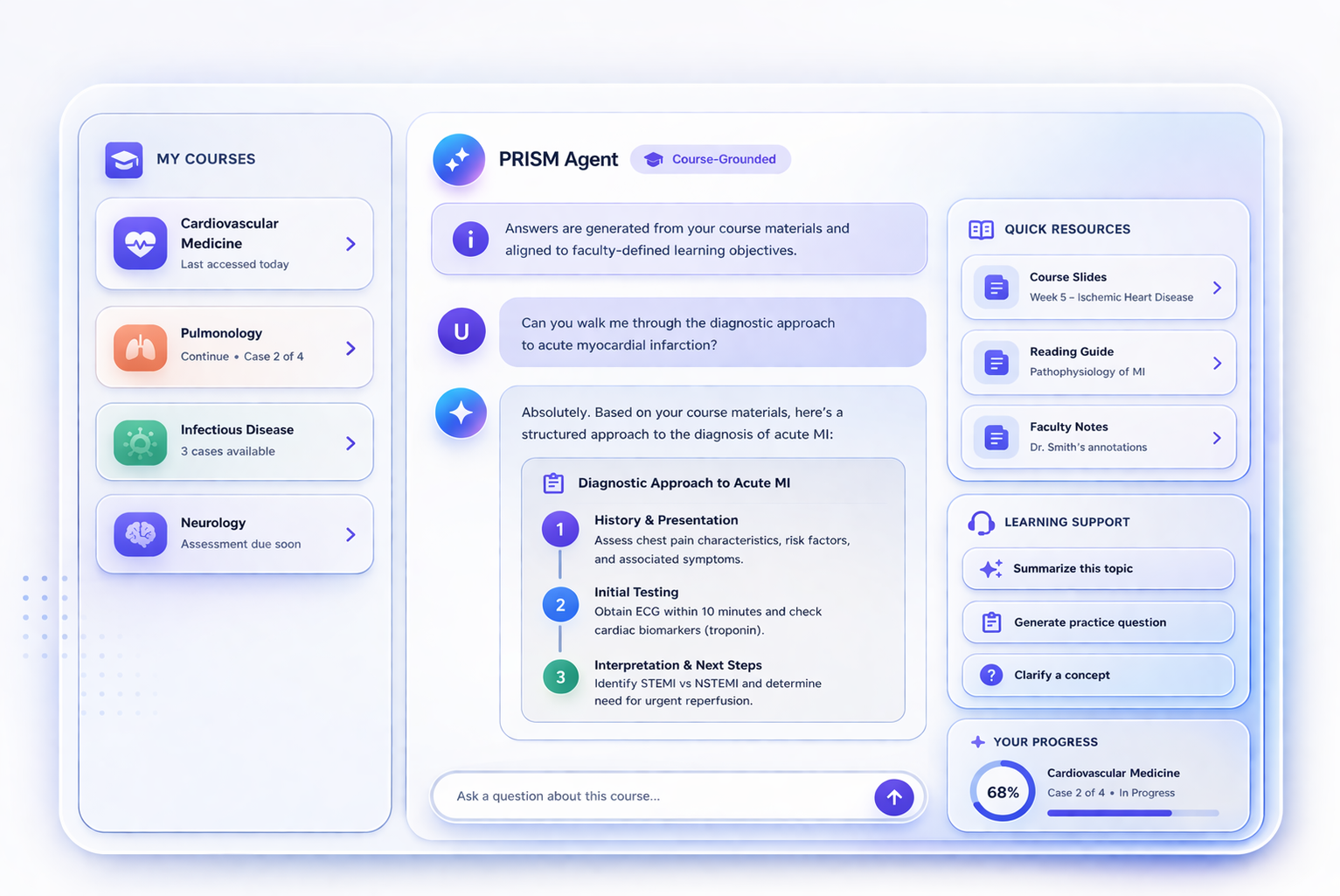 PRISM helps faculty turn teaching priorities, learning objectives, and clinical tradeoffs into guided clinical reasoning rather than static cases or generic chat bots.
