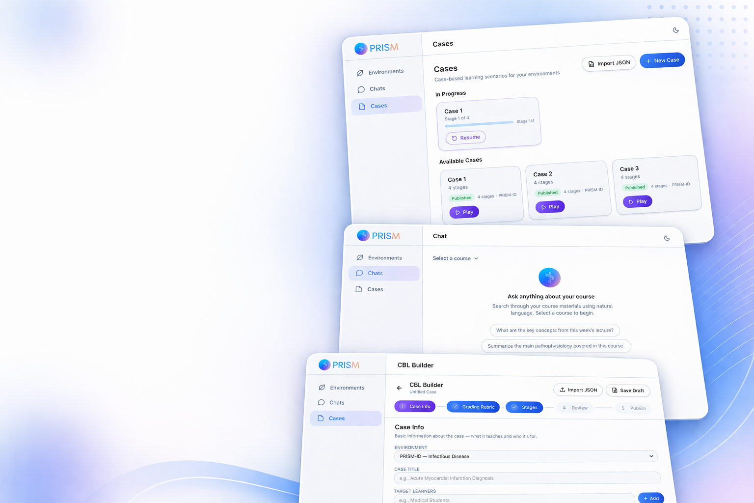 Case-Based Learning is a well-established method in medical education. It links theory to practice through authentic clinical cases and strengthens reasoning, problem solving, and decision making. PRISM is designed to help institutions scale that approach beyond the faculty available to deliver it.